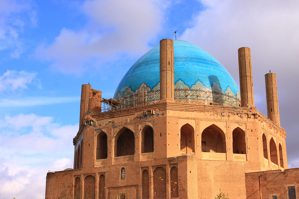 25. Soltaniyeh (2005): the mausoleum of Oljaytu was constructed in 1302–12 in the city of Soltaniyeh, the capital of the Ilkhanid dynasty, which was founded by the Mongols. Situated in the province of Zanjan, Soltaniyeh is one of the outstanding examples of the achievements of Persian architecture and a key monument in the development of its Islamic architecture. The octagonal building is crowned with a 50m tall dome covered in turquoise-blue faience and surrounded by eight slender minarets.