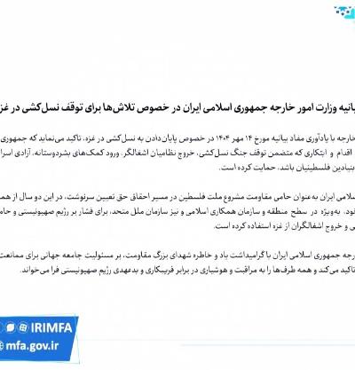 Recalling the contents of its statement dated 6 October 2025 concerning the cessation of genocide in Gaza, the Ministry of Foreign Affairs reaffirms that the Islamic Republic of Iran has consistently supported every measure and initiative aimed at halting the genocidal war, ensuring the withdrawal of occupying forces, enabling the entry of humanitarian assistance, securing the release of Palestinian prisoners, and realizing the fundamental rights of the Palestinian people. As a supporter of the legitimate resistance of the Palestinian nation in its pursuit of the right to self-determination, the Islamic Republic of Iran has, over the past two years, employed all its diplomatic capacities—particularly within the framework of regional mechanisms, the Organization of Islamic Cooperation, and the United Nations—to exert pressure upon the Zionist regime and its backers to end the genocide and withdraw the occupiers from Gaza. Honoring the memory of the great martyrs of the Resistance, the Ministry of Foreign Affairs underscores the responsibility of the international community to prevent the occupying regime’s violations of its obligations, and calls upon all parties to remain vigilant and alert to the deceit and duplicity of the Zionist regime. The Ministry of Foreign Affairs once again stresses that the cessation of crimes and genocide in Gaza does not in any way relieve States and competent international institutions of their shared legal, humanitarian, and moral duty to pursue justice through the identification and prosecution of those who ordered and perpetrated war crimes, genocide, and crimes against humanity in the Gaza Strip, with the aim of bringing an end to the decades-long impunity enjoyed by the Zionist regime.