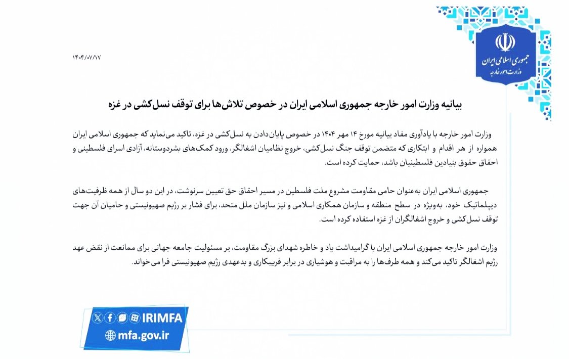Recalling the contents of its statement dated 6 October 2025 concerning the cessation of genocide in Gaza, the Ministry of Foreign Affairs reaffirms that the Islamic Republic of Iran has consistently supported every measure and initiative aimed at halting the genocidal war, ensuring the withdrawal of occupying forces, enabling the entry of humanitarian assistance, securing the release of Palestinian prisoners, and realizing the fundamental rights of the Palestinian people.
