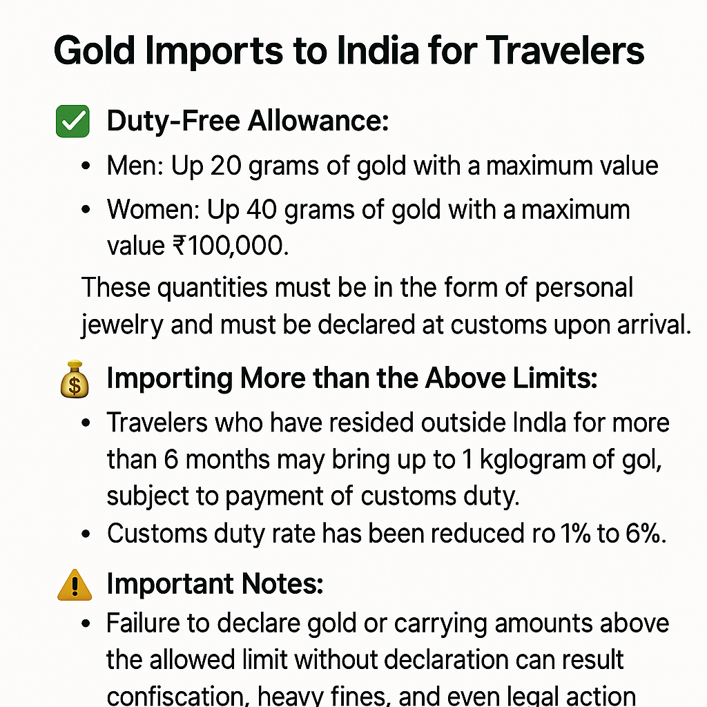 - مسافرانی که بیش از ۶ ماه در خارج از هند اقامت داشتهاند، میتوانند تا ۱ کیلوگرم طلا وارد کنند، مشروط بر پرداخت عوارض گمرکی.